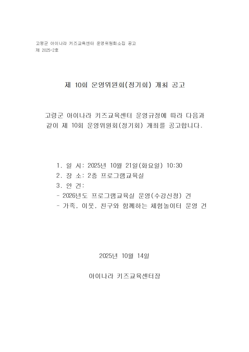| 현재글 | 운영위원회 개최 공고 | 박*실 | 2025.10.14 | 844 | |